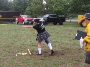 The Players: I had heard that some of the gals from last year would be back and I was excited to see them in action again. Keli (above) came last year and watched us have so much fun that she’s been throwing in games all summer. This was her first Highlander and she did awesome! I scoped out Tammy’s name on the start list and checked the NASGA site for her numbers. Holy crap this woman can throw. I knew between her and Brittney (last year’s champ and world class games competitor) I’d have a great opportunity to watch some amazing throws. As it turns out, Brittney couldn’t make it and we missed her.