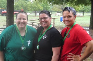 The result: The scores were incredibly close, a good reminder that bombing in one event can throw you off the podium (that’s a memo to me and the need to learn how to throw that stupid rock.) I took first by either a point or half a point, I don’t remember exactly. Tammy took second and Sarah, with just a few points behind, took third. Here we are, still smiling…
