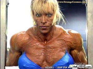 Like, overnight. This belief that women are so incredibly stupid that they are unable to understand that to look like this woman, tons of hours in the gym and tons of drugs will be necessary. Cuz women are SO stoooopid! So we dumb things down for them and give them a dismissive, “You’re too stupid for me to teach you the fact that simple weight training will be good for you and I’ll tell you over time how so I’ll treat you like the silly person you are who obviously is only worth my sarcasm since training with weights is scary for you and I’m an expert weight trainer.”