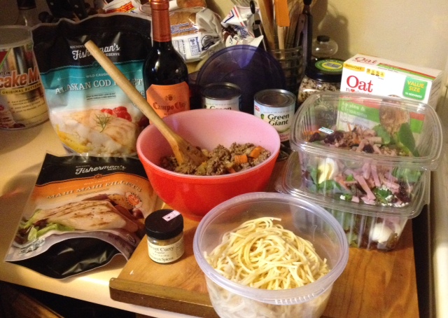 Protein Pancake mix for quick breakfast carbs; fish ready to go into the oven; wine (always); green beans (I really hate veggies but will eat these); Oatmeal; salads from the salad bar (one per day); 93/7 lean hamburger mixed with sweet onion and sweet potato; pasta with Italian dressing. I have another pound of hamburger in the fridge I’ll make up tomorrow. I’ll go and get two more salads on Wednesday, enjoy one treat of a Q’doba burrito bowl and I’m set until the Bigg guy gets home from the Middle East on Friday. When he’s home? Take this, add a meat smoking session of at least 10# of something tasty and multiply everything else by at least three. EZPZ. Time consuming? Sure, a bit. Not bad and gee whiz, whatever I miss in life while doing it will just have to be missed. I know I’ve set myself up for a great week of food. All food is portable, mostly. If you’re just so special that you absolutely can’t make some food and take it with you so you have to go through drive thru’s and eat their shitty food (remember, McDon’s has salads YO!), then go ahead and be fat and unhealthy. You win.