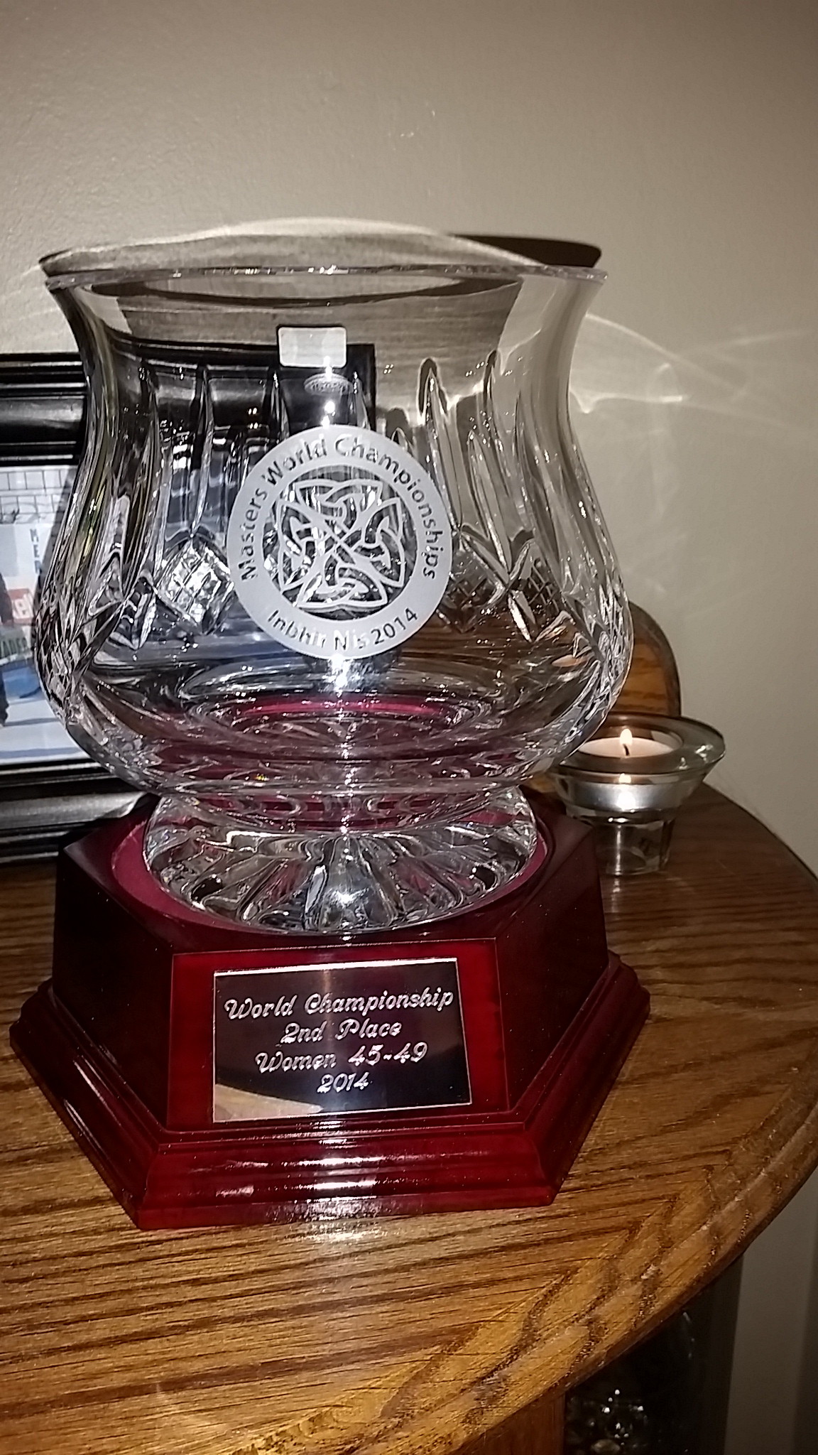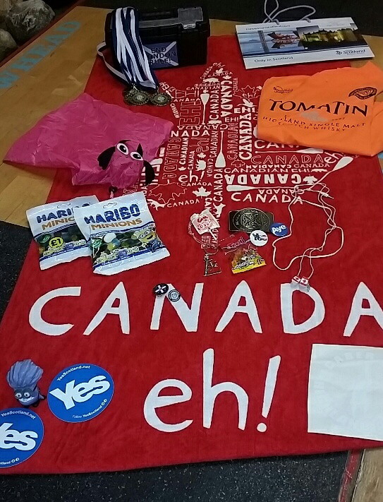 The funny thing is there is already a lot missing from this picture. Assume that when you put a small bottle of Scotch in each swag bag it won’t last long enough to be in the prize picture…true story. The Minion gummies were hilarious. The first bag was from my Flat mate Melanie who handed them to me and said, ‘I know you’re probably not going to eat these but I saw them and thought of you.’ Soooo awesome!!!! I got the second bag the next day on the field from Champ Mona who said, ‘I know you’re not going to eat these but we saw them and knew you had to have them.’ So adorable. The Canadia eh? flag is another favorite and I’ve been fighting off my daughter for that and the Maple Leaf headphones. The maple suckers are long gone and what you can’t see is a small charm with a wee one holding a caber. Two pins, one from my favorite Indiana fellow Master’s thrower Dawn Higgins and a MWC pin. Both are staying off the kilt until I get in some pin keepers back locksto make them stay put. I lost my Women’s Heavy Athletics pin on the field at some point in Scotland and was kind of LeSad about that. I didn’t even notice until I was talking with Judge Steph Stewart (who I didn’t even KNOW was in Scotland until late into Sunday night at the Tastle Cavern) and she suggested I get those to avoid losing pins in the future. Thanks again Steph! (I’m actually pretty proud I even remember that conversation;)