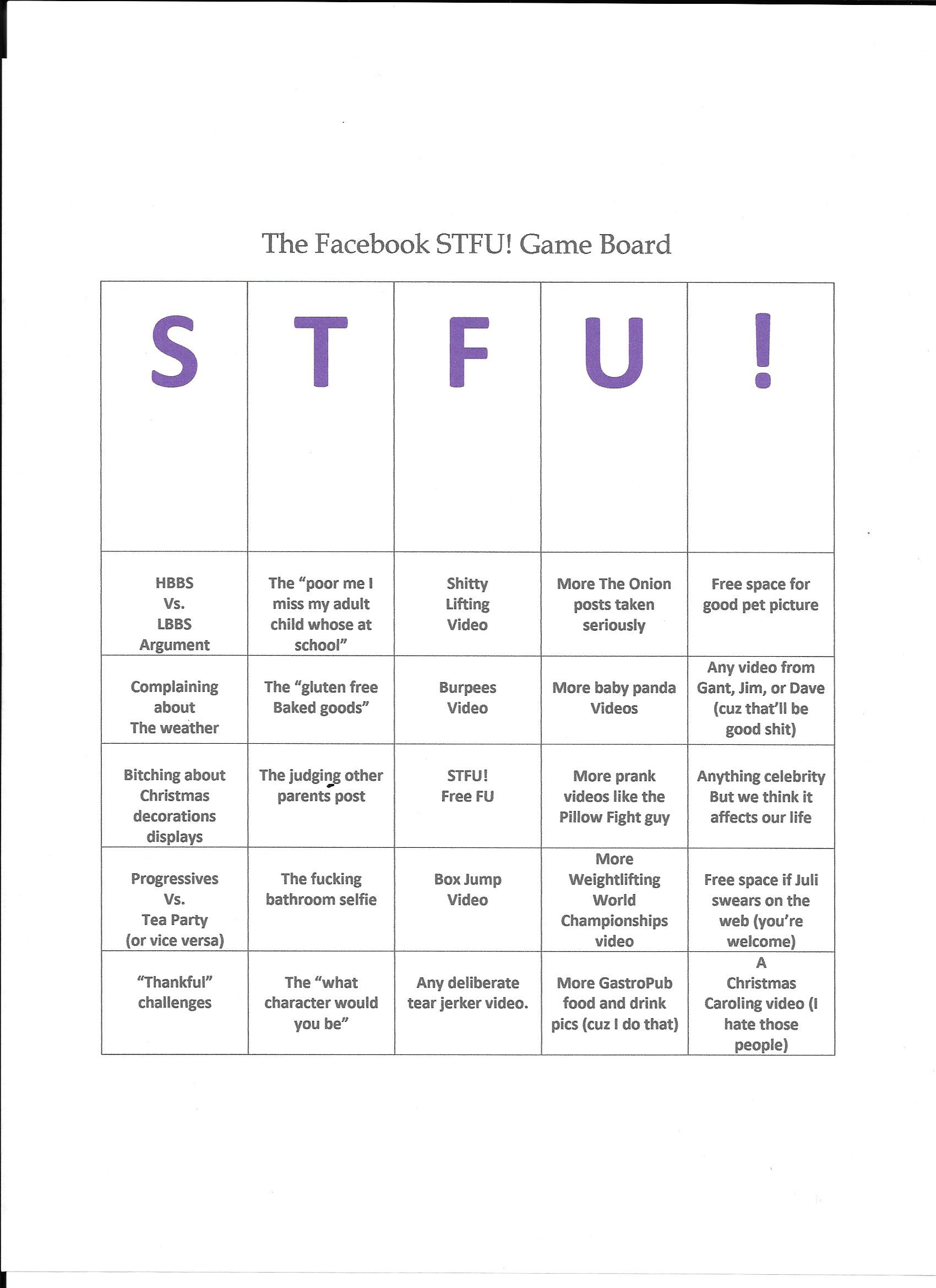Here’s how it works, anytime you see or read anything on the board, you get to place your token (use whatever you have for tokens; pennies, tic-tac’s, d-bol capsule) on the board. Once you have a STFU! down, across, or diagonal, you win! Shout that shit out too.