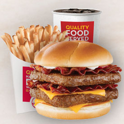 The other day we were on an errand running marathon. At some point, I realized that it’d been a couple of hours and we weren’t even close to being done. Since I was driving, I declared a snack stop. We buzzed into Wendy’s (have you ever had one of those little mini-Frosty’s? They’re delish.) I actually got a mini sammich, Matt got three or four mini-burgers and then I get to Oz (reminding him that this is a snack break) and he orders this: